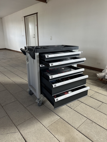 193. 14. Verktygsvagn på hjul 6 lådor fyllda med ve...