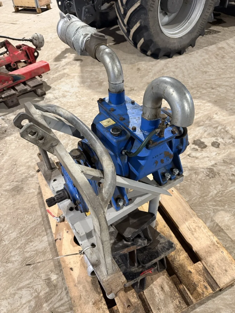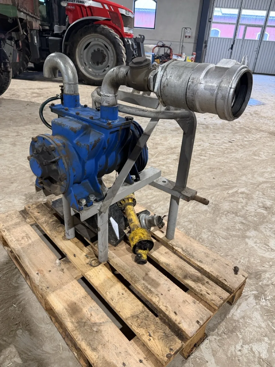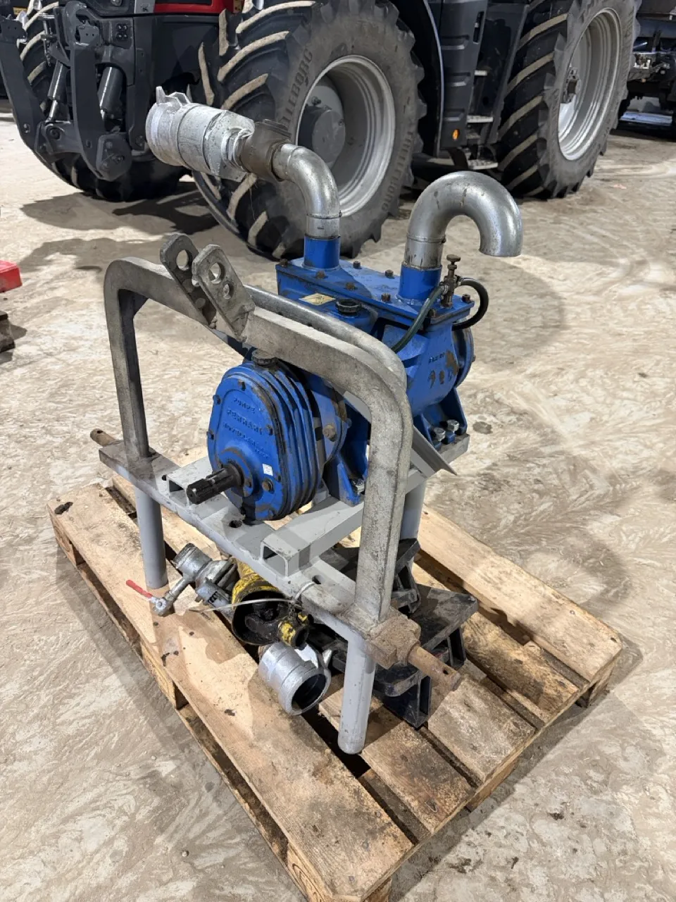 Till att blåsa tomt bevattningsmaskiner. - Traktordriven kompressor på stativ