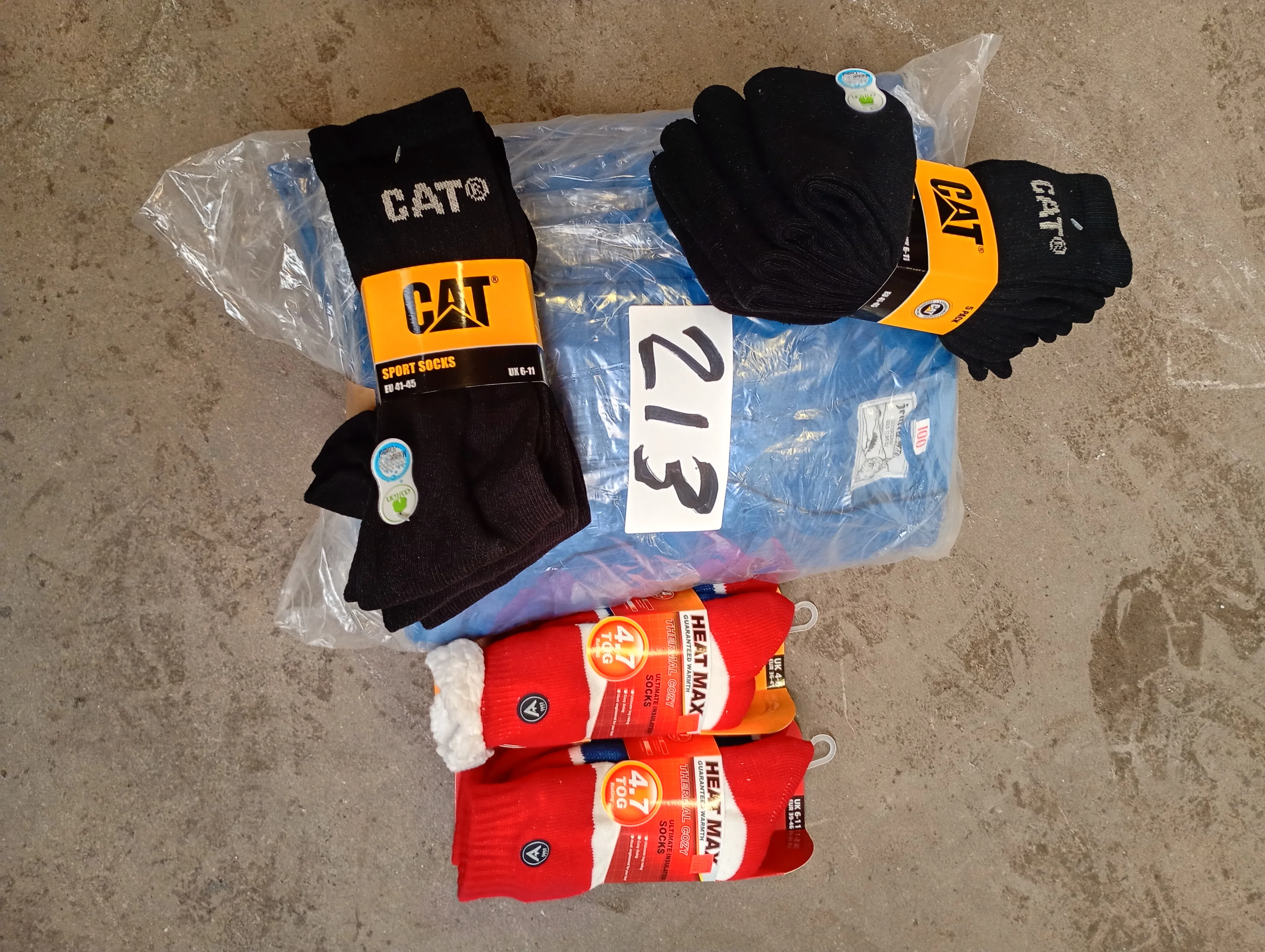 213. Parti arbetsoveraller, arbetsbyxor, skor, strumpor, tröjor