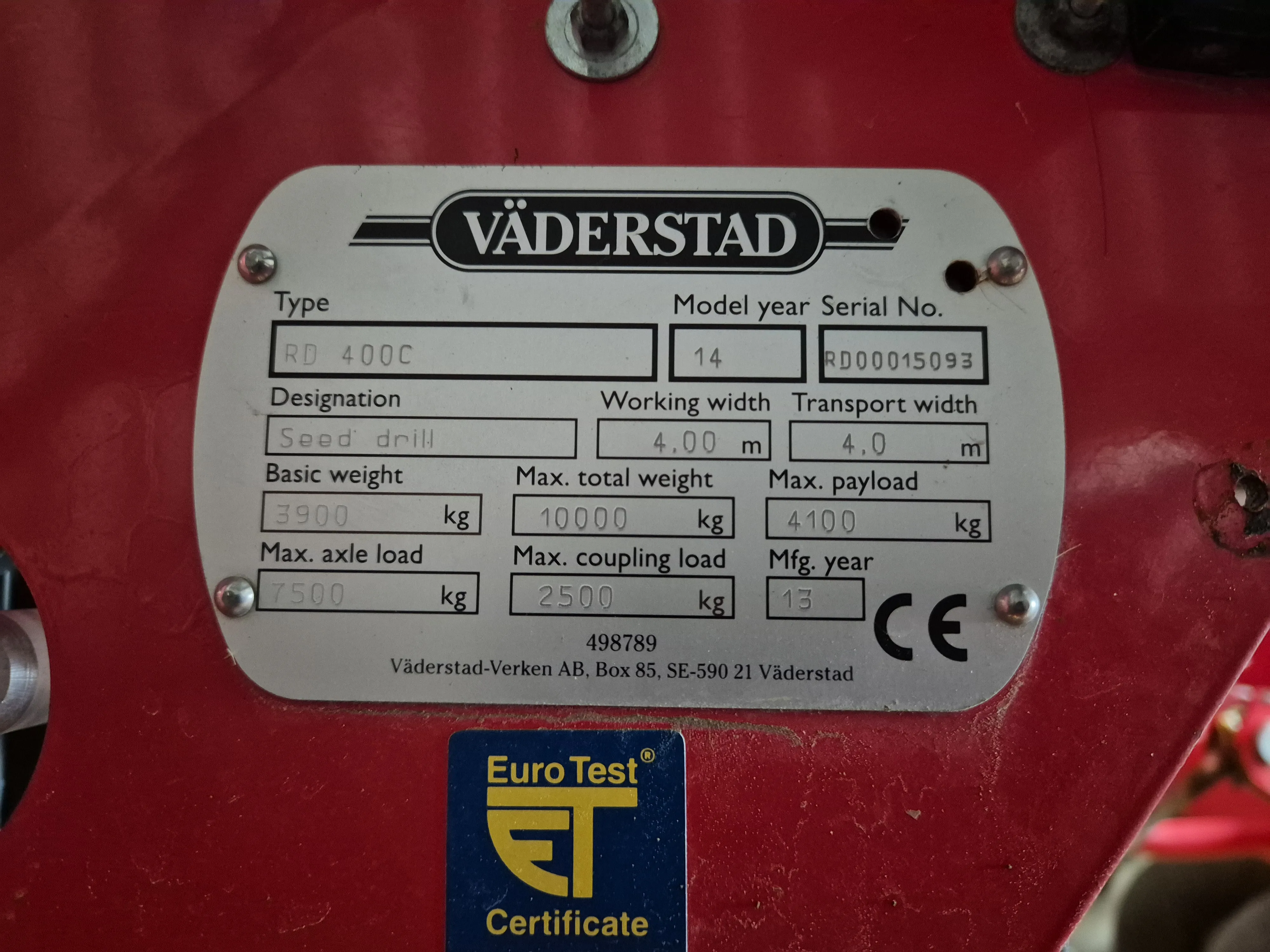 2656 hektar. Utrustning: Mellanpackare. Biodrill (frölåda). Crossboard. System Disc Aggresive. Autocheck. Ritsmarkör. Galler i gödning och utsädeslåda. Kamera och belysning i gödning och utsädeslåda. 4 st arbetsbelysning bakåt. Instruktionsbok och reservdelskatalog. En ägare sedan ny. - Väderstad Rapid RD 400 C - 2014
