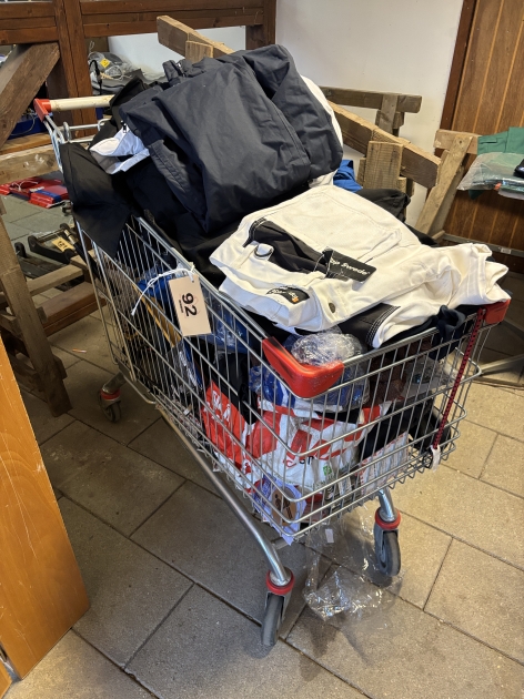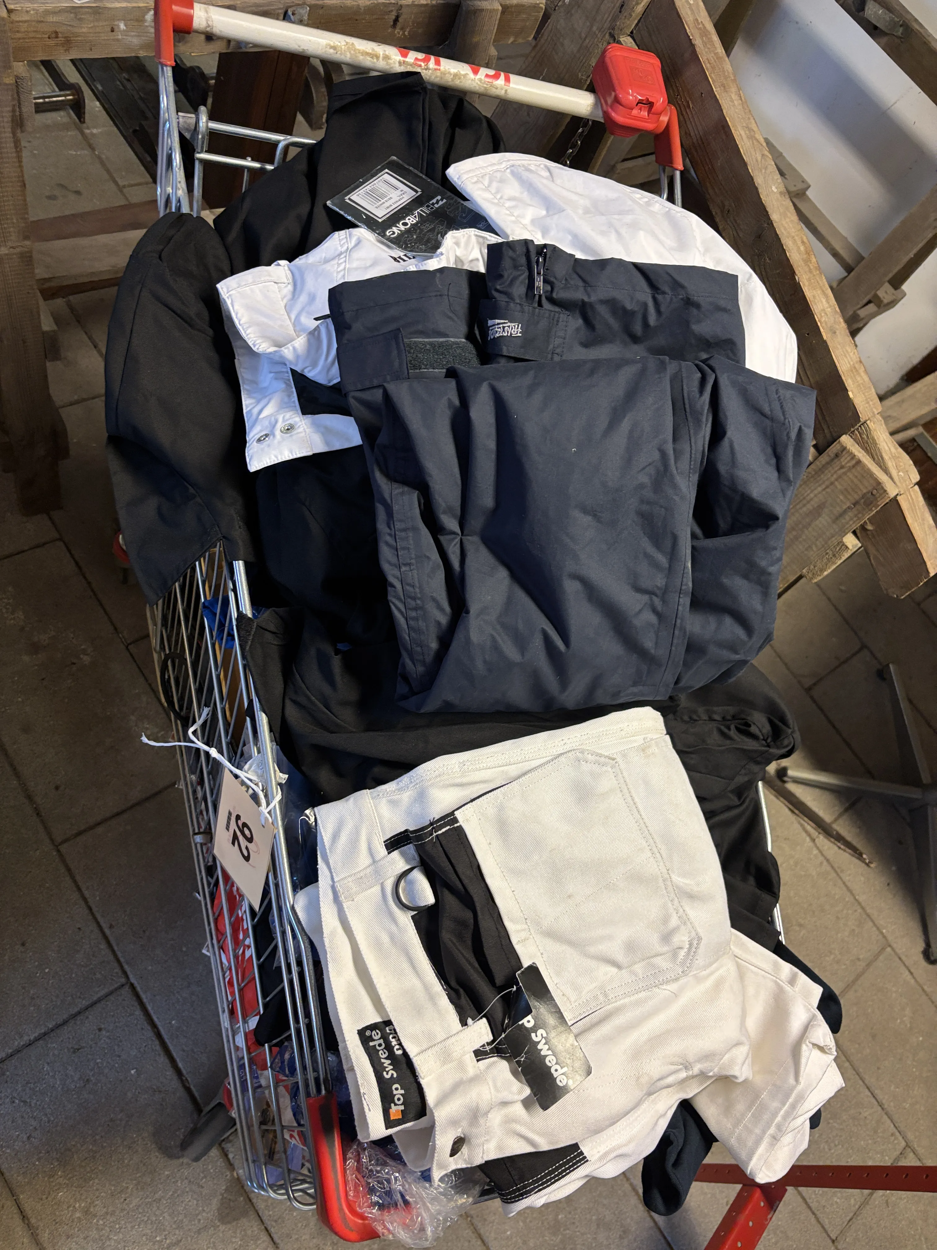 92. Verkstad, Kundvagn full med arbetskläder i olika storlekar