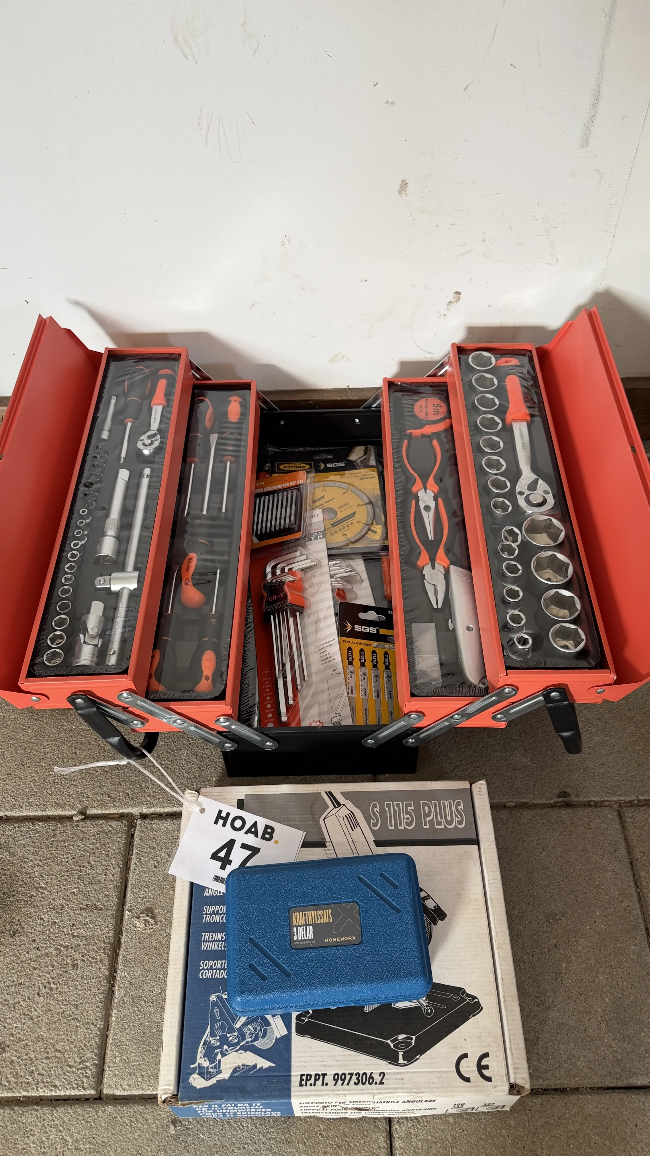47. Verkstad, Verktygslåda full med verktyg ställning för vinkelslip krafthylsor