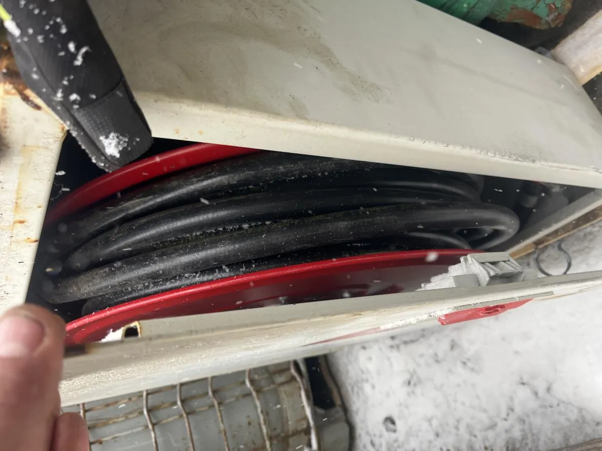 146. Verkstadsutrustning, Verktygsvagn med skruvstycke. Brandslang